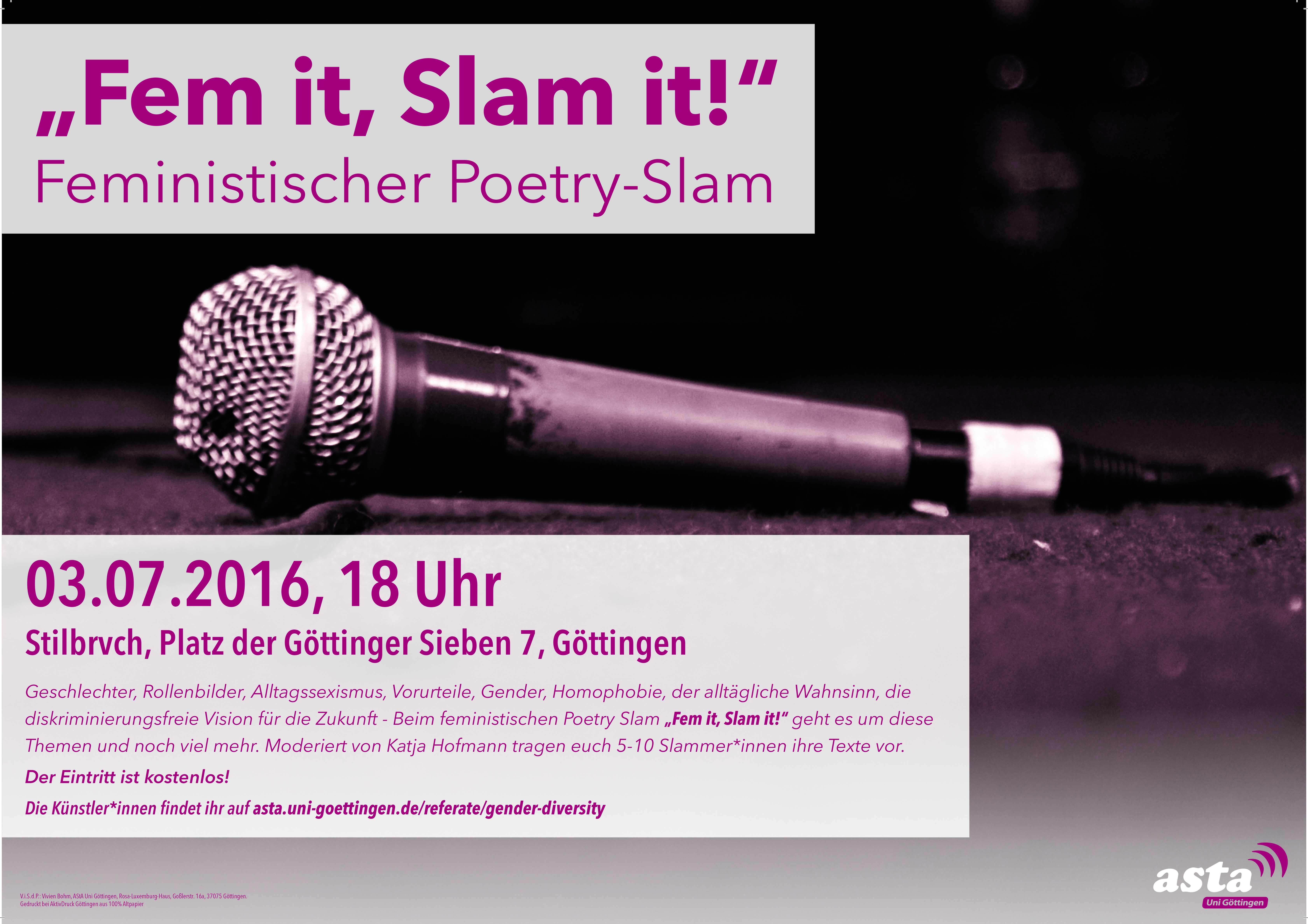 - 03.07., 18 Uhr: Feministischer Poetry Slam "Fem it, Slam it!"