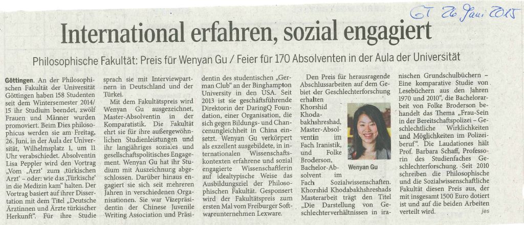 • Seit 2010 schreiben die Philosophische und die Sozialwissenschaftliche Fakultät diesen Preis aus, der mit insgesamt 1500 Euro dotiert ist und in diesem Jahr auf die beiden Arbeiten verteilt wurde.